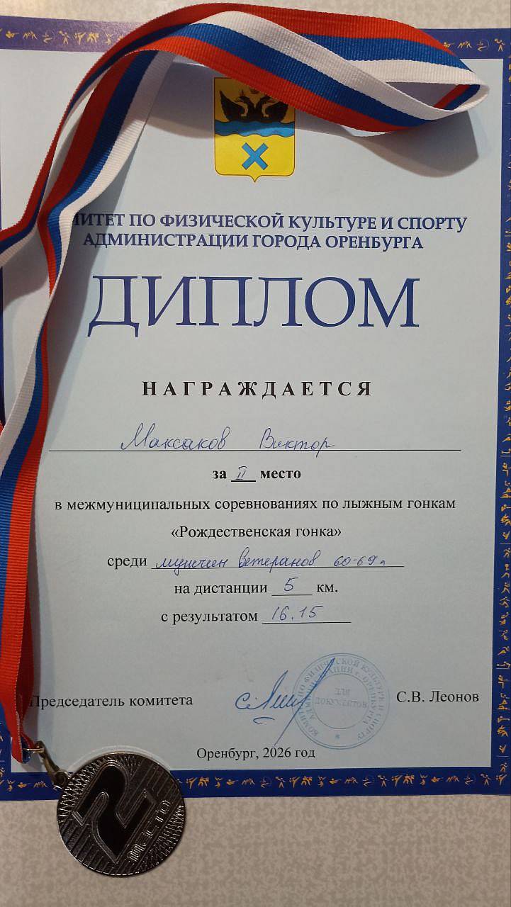 10 января в Оренбурге прошла захватывающая Рождественская гонка, собравшая лучших лыжников Оренбургской области и Республики Башкортостан. Особое внимание заслуживает выступление наших ветеранов спорта. Мужчины возрастной группы 60-69 лет показали невероятную силу духа и выносливость. Второе место среди мужчин на дистанции 5 км завоевал наш тренер-преподаватель Максаков Виктор Тимофеевич. Его результат составил всего лишь 16 минут 15 секунд. Поздравляем Виктора Тимофеевича с заслуженной победой и желаем дальнейших успехов!