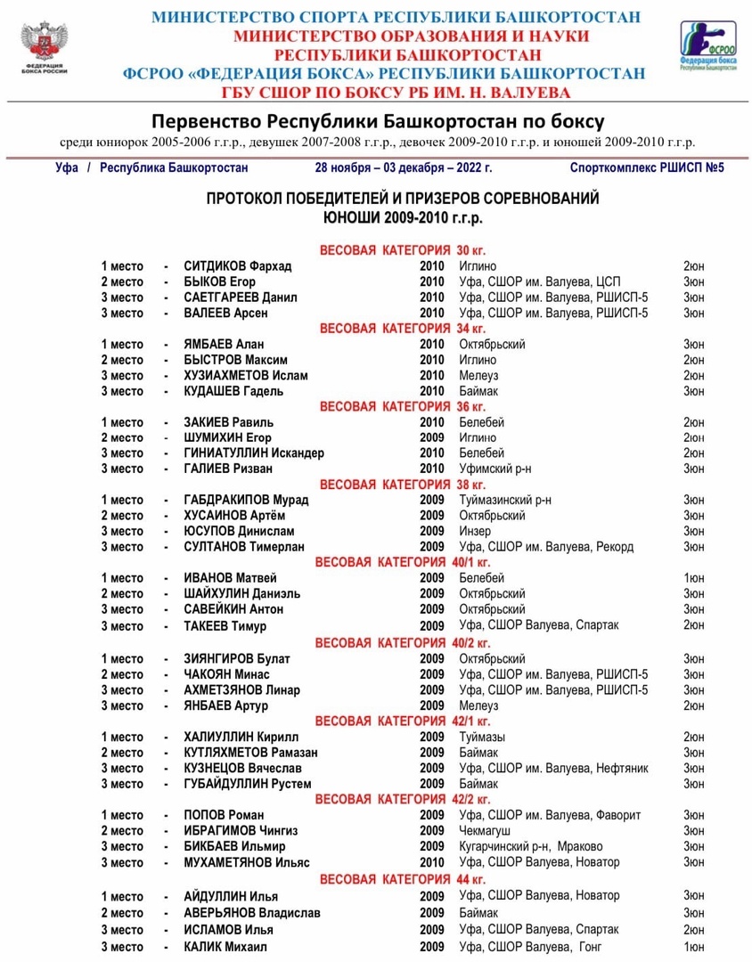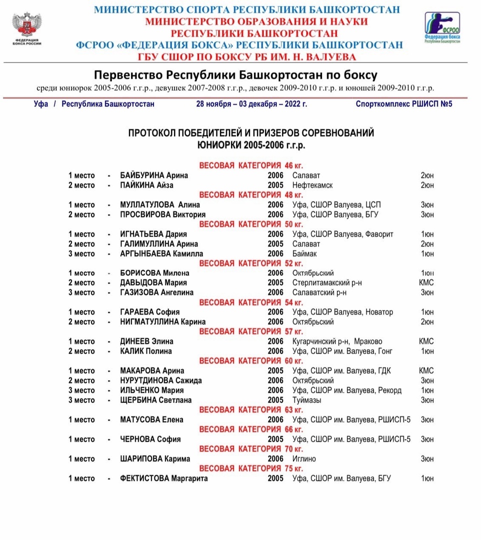 С 28 ноября по 2 декабря 2022 года в Уфе состоялось Первенство Республики Башкортостан по боксу среди юниорок, девушек и юношей 2009-2010 гг.р. В соревнованиях приняли участие 375 спортсменов со всех районов и городов Республики Башкортостан. По итогам пяти соревновательных дней Динеева Элина стала обладательницей золотой медали, Бикбаев Ильмир - бронзовой. Тренер-преподаватель Сальтяшев Халит Хурматуллович. Отметим, что лучшие боксёры войдут в состав сборной команды РБ, которые в 2023 году будут представлять нашу республику на всероссийских и межрегиональных соревнованиях.